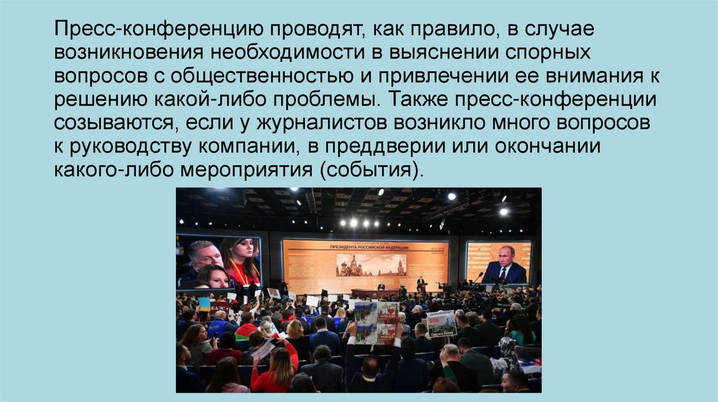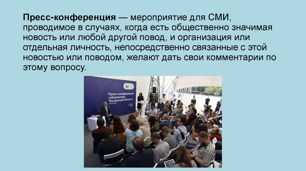 Пресс-конференция — мероприятие для СМИ,проводимое в случаях, когда есть общественно значимая