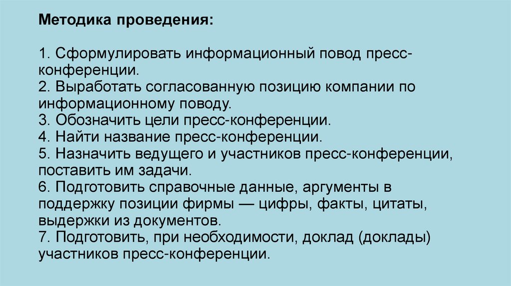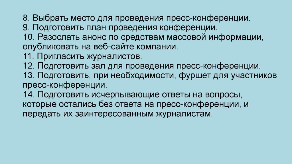8. Выбрать место для проведения пресс-конференции.9. Подготовить план проведения конференции.