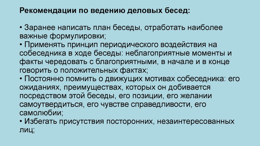 Рекомендации по ведению деловых бесед:• Заранее написать план беседы, отработать наиболее