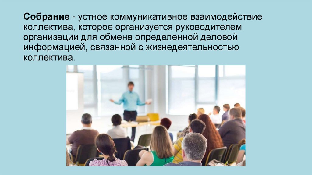 Собрание - устное коммуникативное взаимодействиеколлектива, которое организуется руководителем