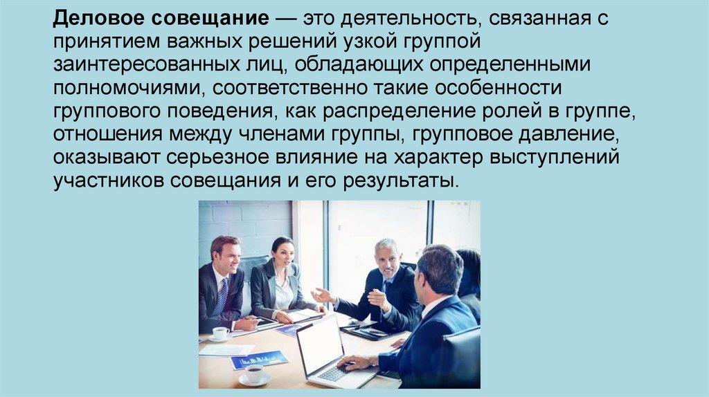 Деловое совещание — это деятельность, связанная спринятием важных решений узкой группой