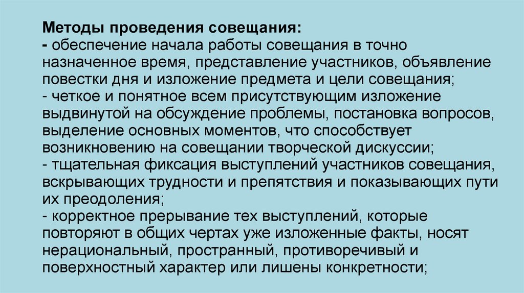 Методы проведения совещания:- обеспечение начала работы совещания в точно