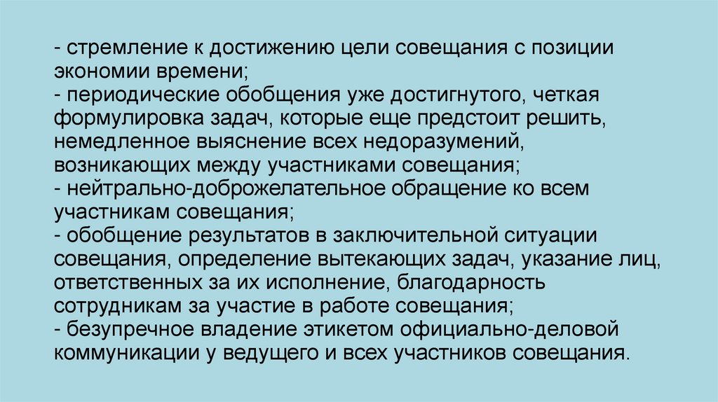 - стремление к достижению цели совещания с позицииэкономии времени;
