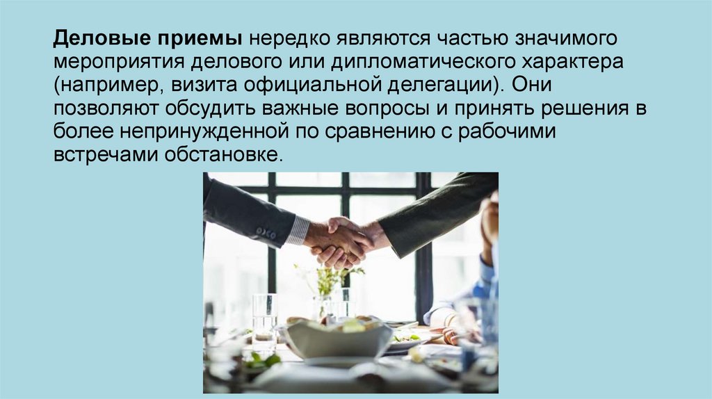 Деловые приемы нередко являются частью значимогомероприятия делового или дипломатического характера