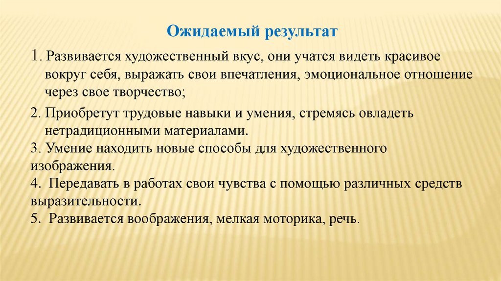 Ожидаемый результат1. Развивается художественный вкус, они учатся видеть красивое