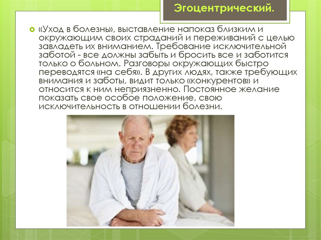 Эгоцентрический.«Уход в болезнь», выставление напоказ близким и