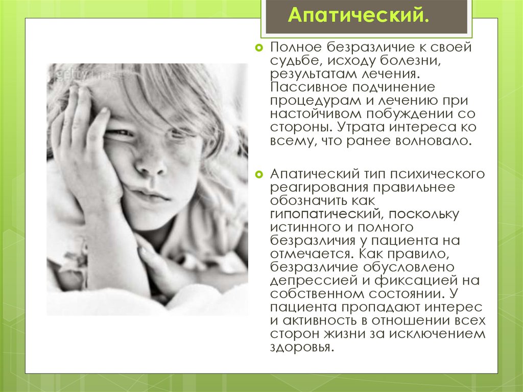 Апатический.Полное безразличие к своей