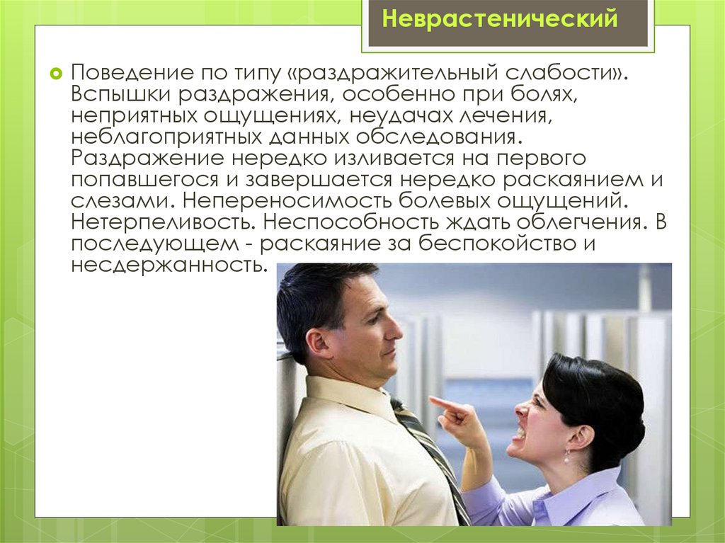НеврастеническийПоведение по типу «раздражительный слабости».