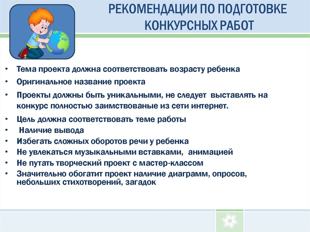 • Тема проекта должна соответствовать возрасту ребенка