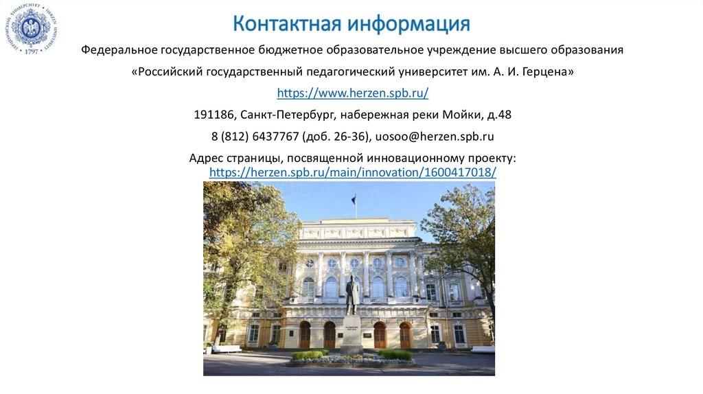 8 (812) 6437767 (доб. 26-36), uosoo@herzen.spb.ru