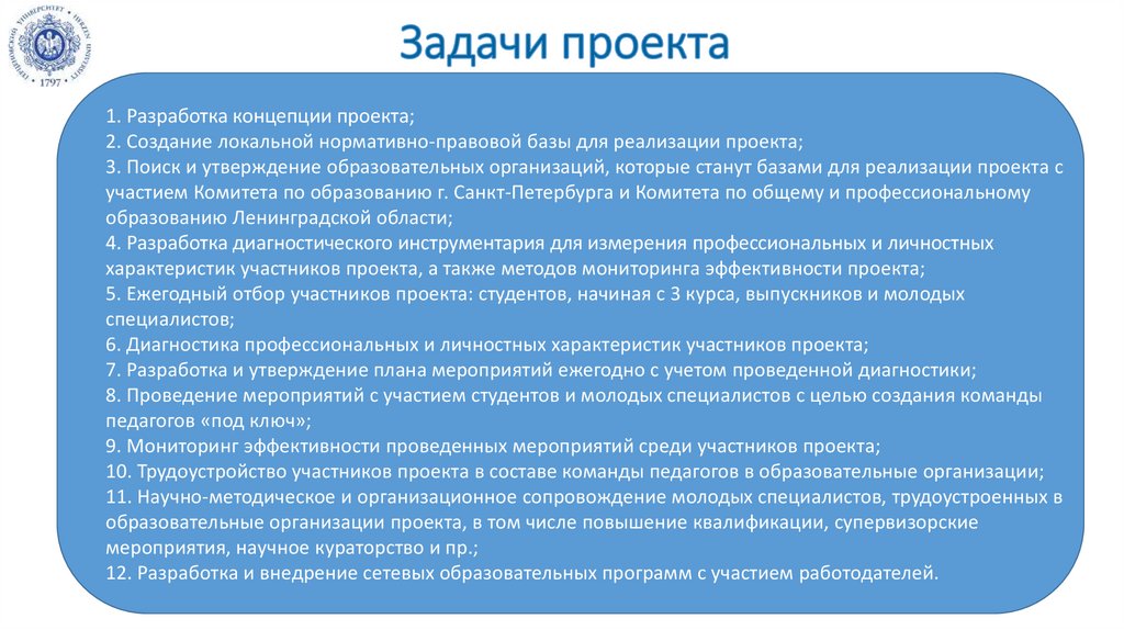 1. Разработка концепции проекта;2. Создание локальной нормативно-правовой базы для реализации проекта;