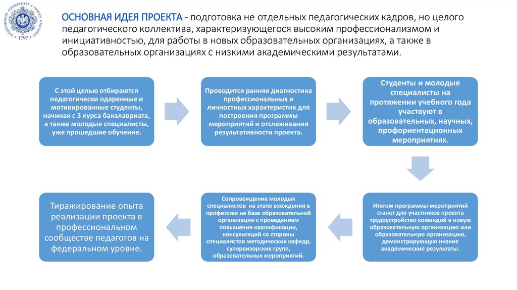 ОСНОВНАЯ ИДЕЯ ПРОЕКТА - подготовка не отдельных педагогических кадров, но целогопедагогического коллектива, характеризующегося высоким профессионализмом и