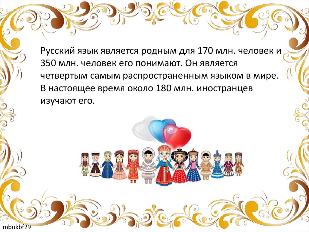 Русский язык является родным для 170 млн. человек и350 млн. человек его понимают. Он является