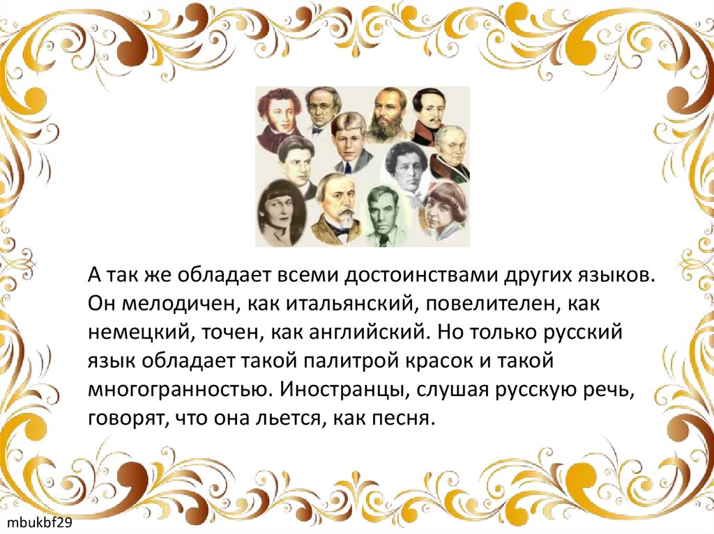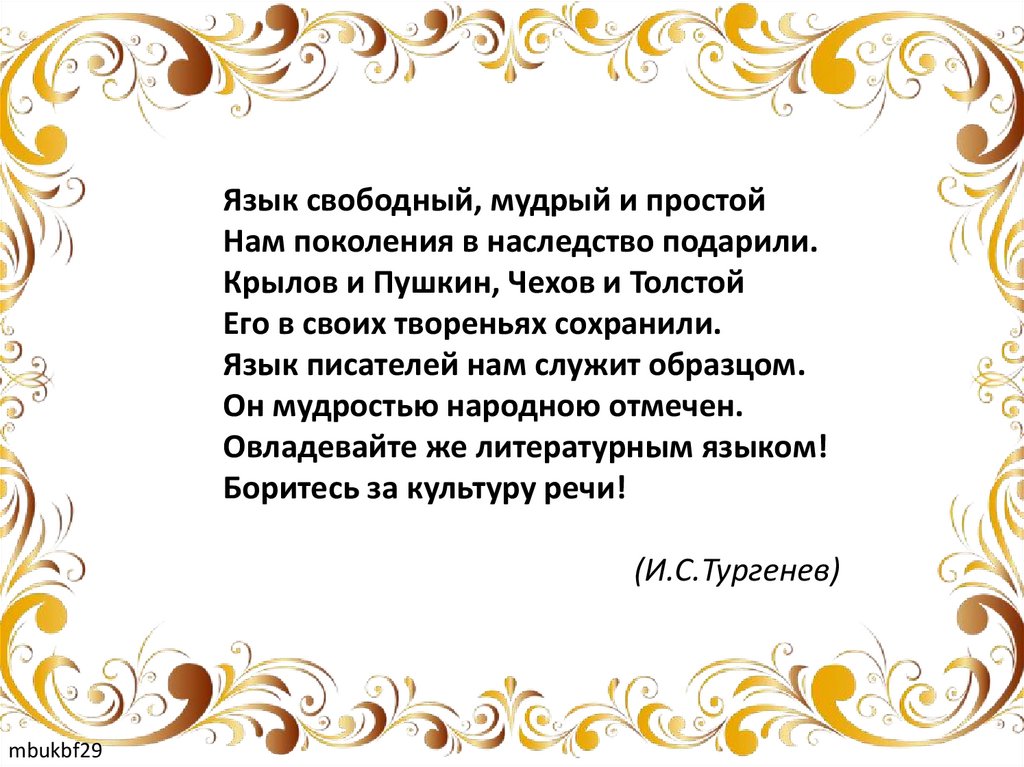 Язык свободный, мудрый и простойНам поколения в наследство подарили.
