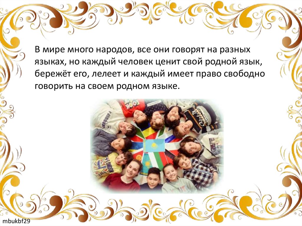 В мире много народов, все они говорят на разныхязыках, но каждый человек ценит свой родной язык,