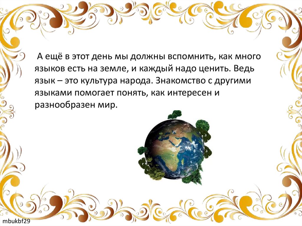 А ещё в этот день мы должны вспомнить, как многоязыков есть на земле, и каждый надо ценить. Ведь