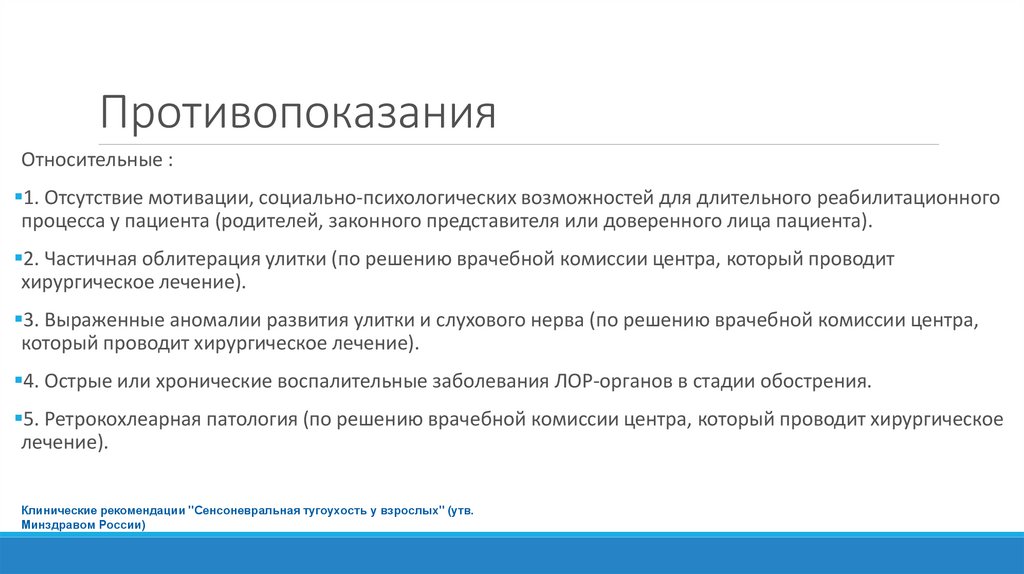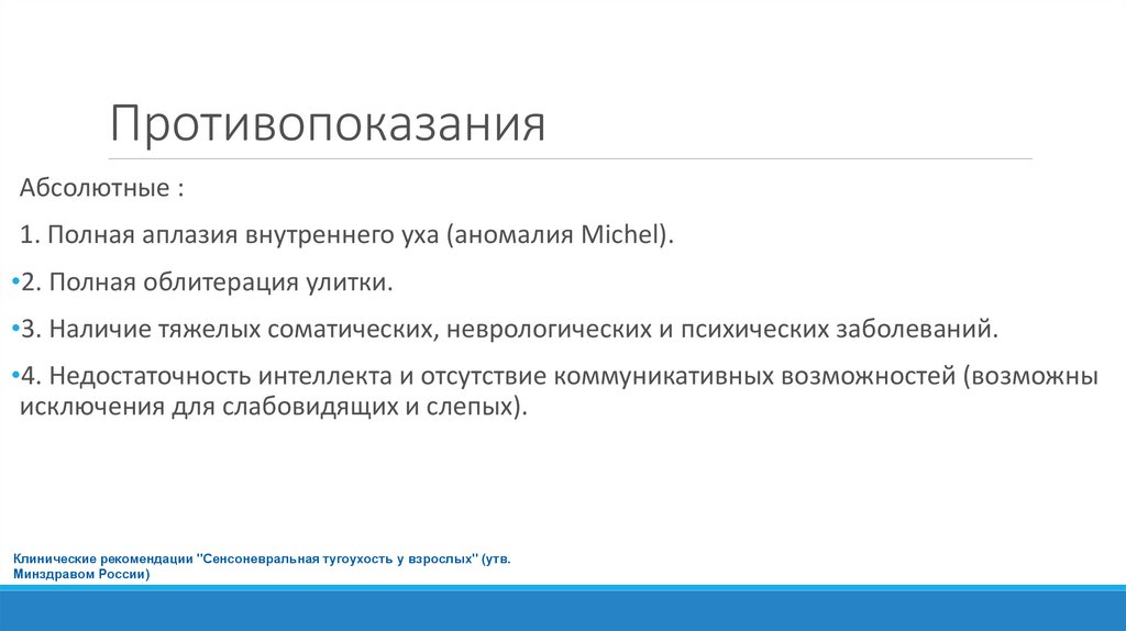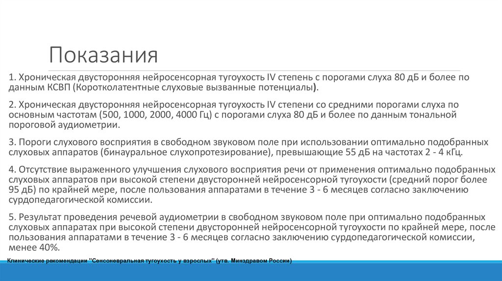 Показания1. Хроническая двусторонняя нейросенсорная тугоухость IV степень с порогами слуха 80 дБ и более по