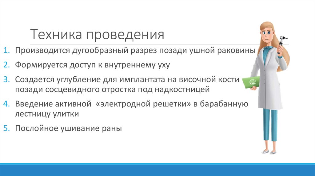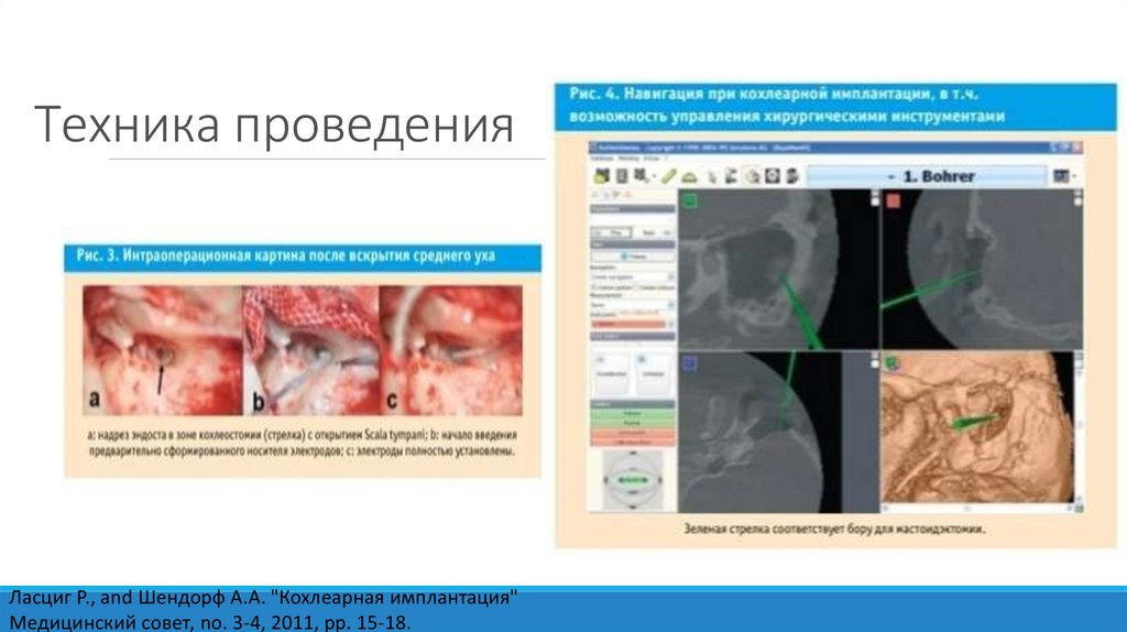 Техника проведенияЛасциг Р., and Шендорф А.А. "Кохлеарная имплантация"