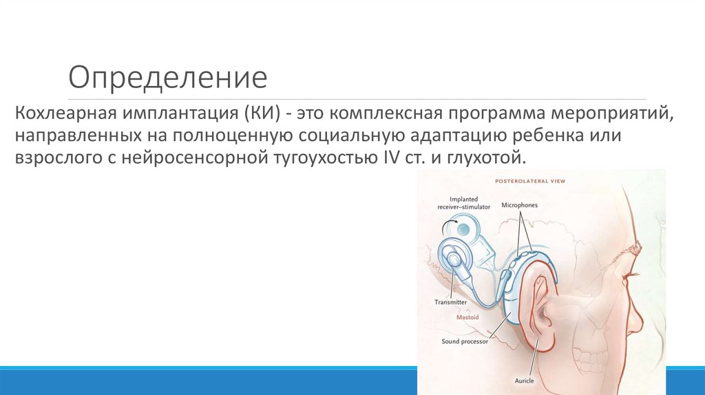 ОпределениеКохлеарная имплантация (КИ) - это комплексная программа мероприятий,
