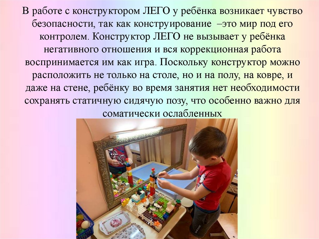 В работе с конструктором ЛЕГО у ребёнка возникает чувствобезопасности, так как конструирование –это мир под его