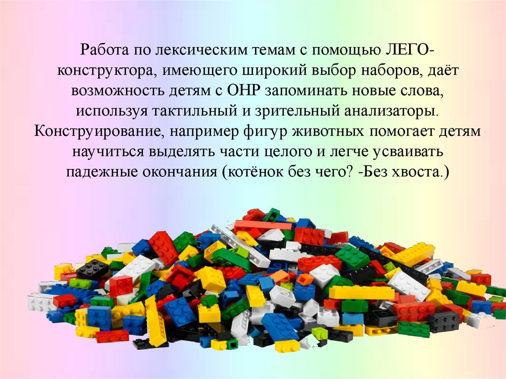 Работа по лексическим темам с помощью ЛЕГОконструктора, имеющего широкий выбор наборов, даётвозможность детям с ОНР запоминать новые слова,