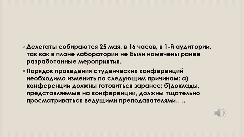 ◦ Делегаты собираются 25 мая, в 16 часов, в 1-й аудитории,так как в плане лаборатории не были намечены ранее