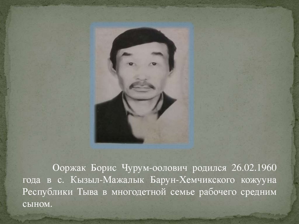 Ооржак Борис Чурум-оолович родился 26.02.1960года в с. Кызыл-Мажалык Барун-Хемчикского кожууна