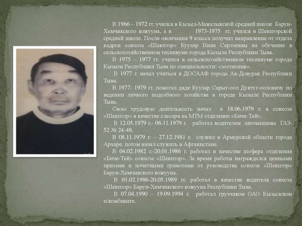 В 1977- 1979 гг. помогал дяде Куулар Сарыг-оол Дуктуг-ооловичу по
