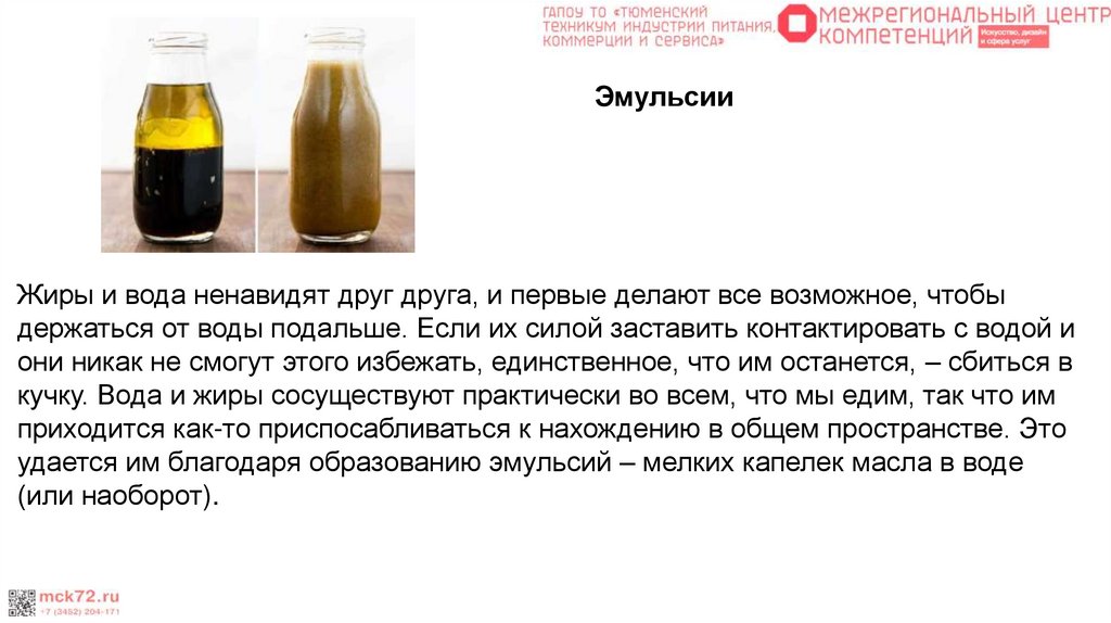 ЭмульсииЖиры и вода ненавидят друг друга, и первые делают все возможное, чтобы