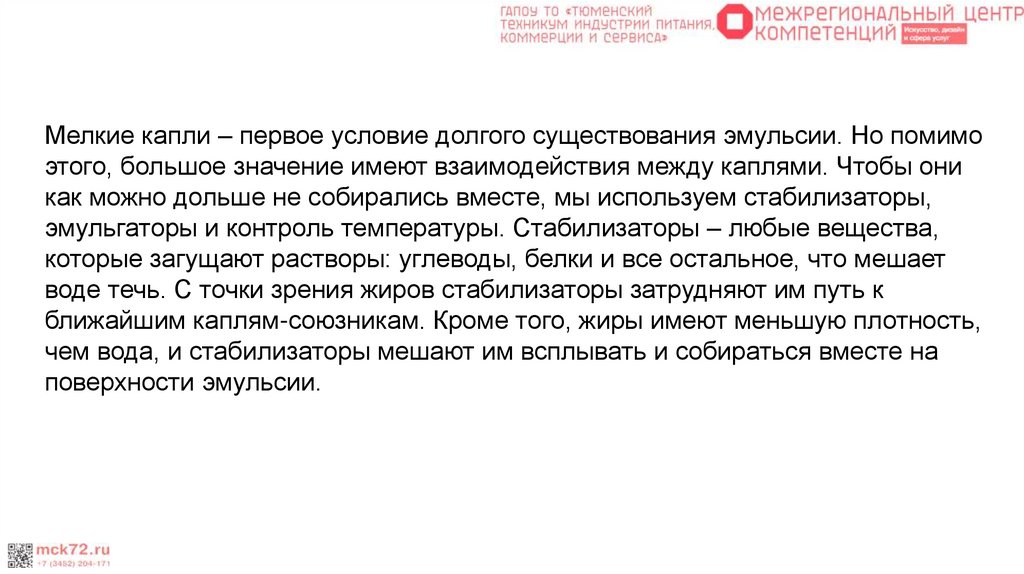 замедляется, и эмульсия будет существовать дольше, если липидные капли