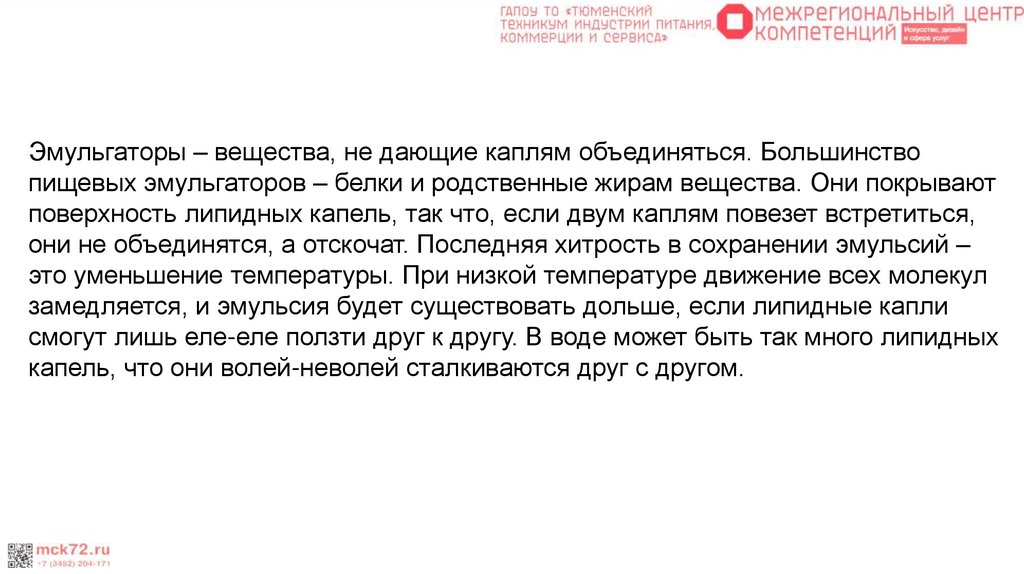Эмульгаторы – вещества, не дающие каплям объединяться. Большинствопищевых эмульгаторов – белки и родственные жирам вещества. Они покрывают