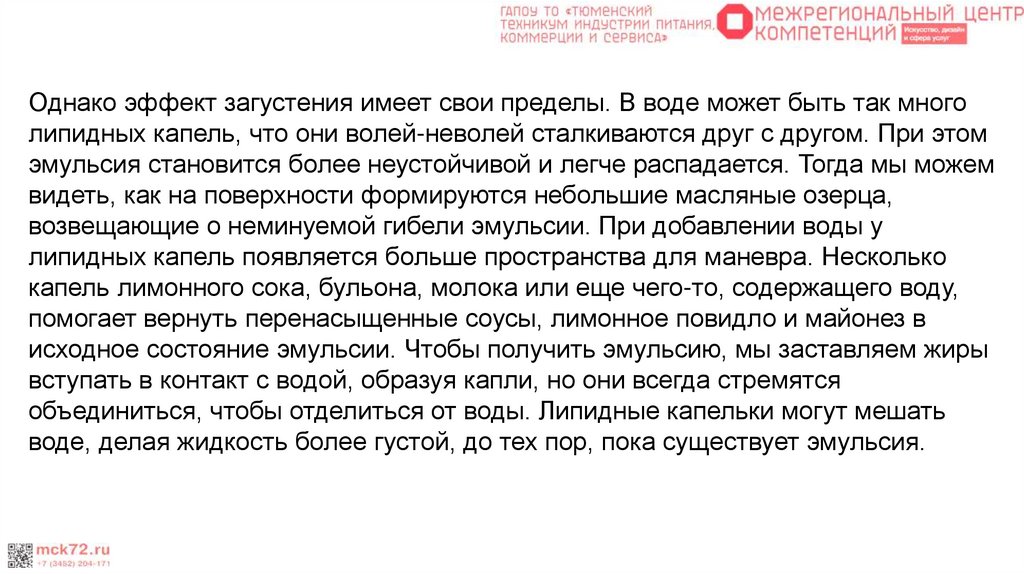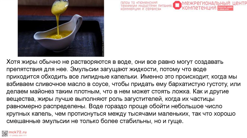 Хотя жиры обычно не растворяются в воде, они все равно могут создаватьпрепятствия для нее. Эмульсии загущают жидкости, потому что воде