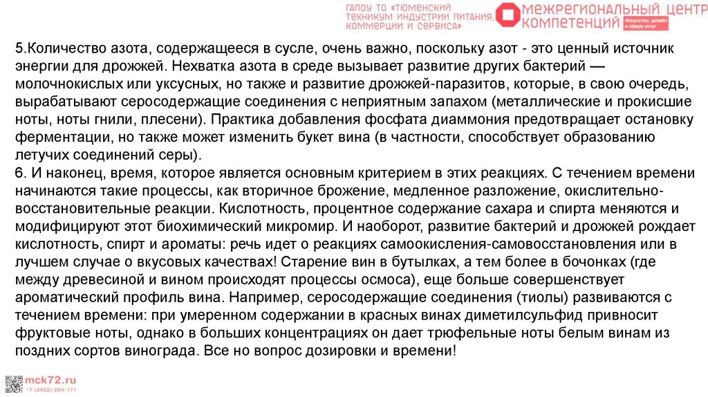 5.Количество азота, содержащееся в сусле, очень важно, поскольку азот - это ценный источникэнергии для дрожжей. Нехватка азота в среде вызывает развитие других бактерий —