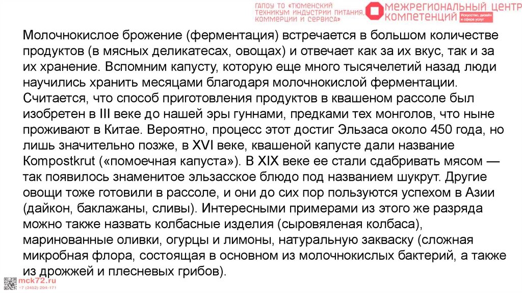 Молочнокислое брожение (ферментация) встречается в большом количествепродуктов (в мясных деликатесах, овощах) и отвечает как за их вкус, так и за