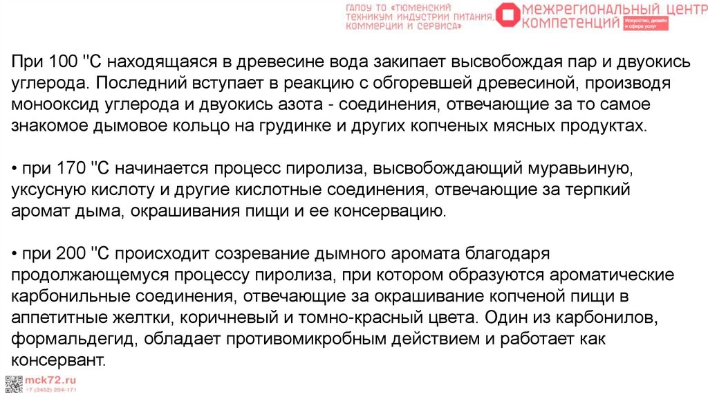При 100 "С находящаяся в древесине вода закипает высвобождая пар и двуокисьуглерода. Последний вступает в реакцию с обгоревшей древесиной, производя