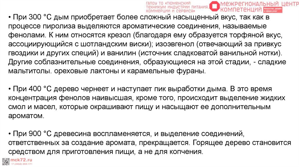 • При 300 °С дым приобретает более сложный насыщенный вкус, так как впроцессе пиролиза выделяются ароматические соединения, называемые