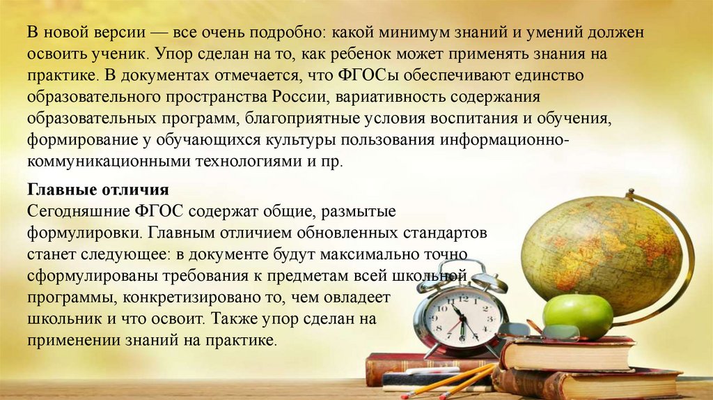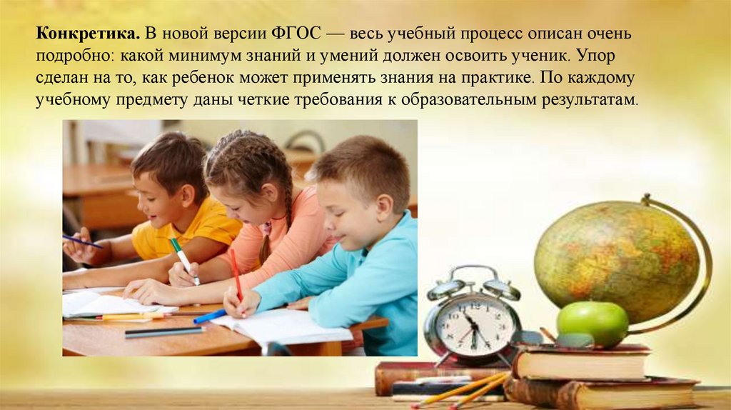 Конкретика. В новой версии ФГОС — весь учебный процесс описан оченьподробно: какой минимум знаний и умений должен освоить ученик. Упор