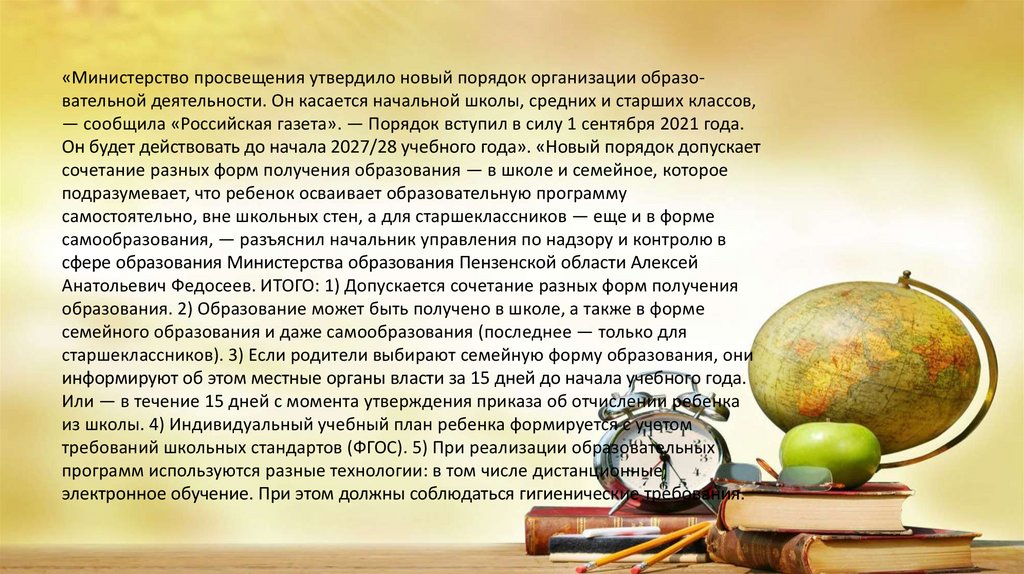 «Министерство просвещения утвердило новый порядок организации образовательной деятельности. Он касается начальной школы, средних и старших классов,— сообщила «Российская газета». — Порядок вступил в силу 1 сентября 2021 года.