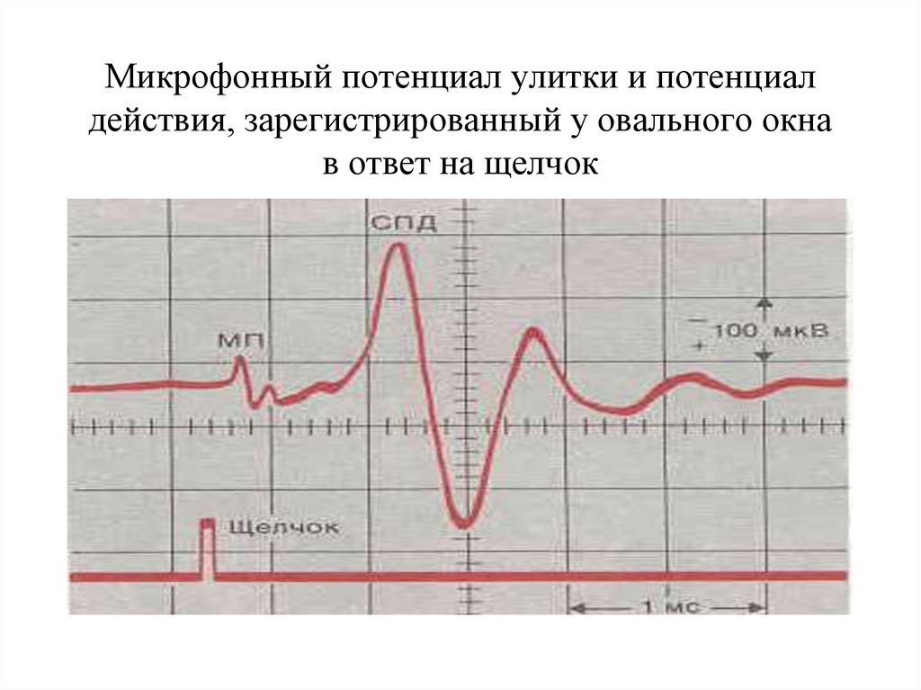 Микрофонный потенциал улитки и потенциалдействия, зарегистрированный у овального окна