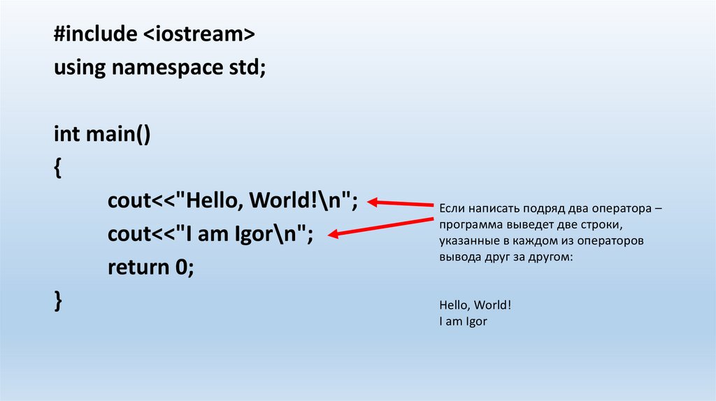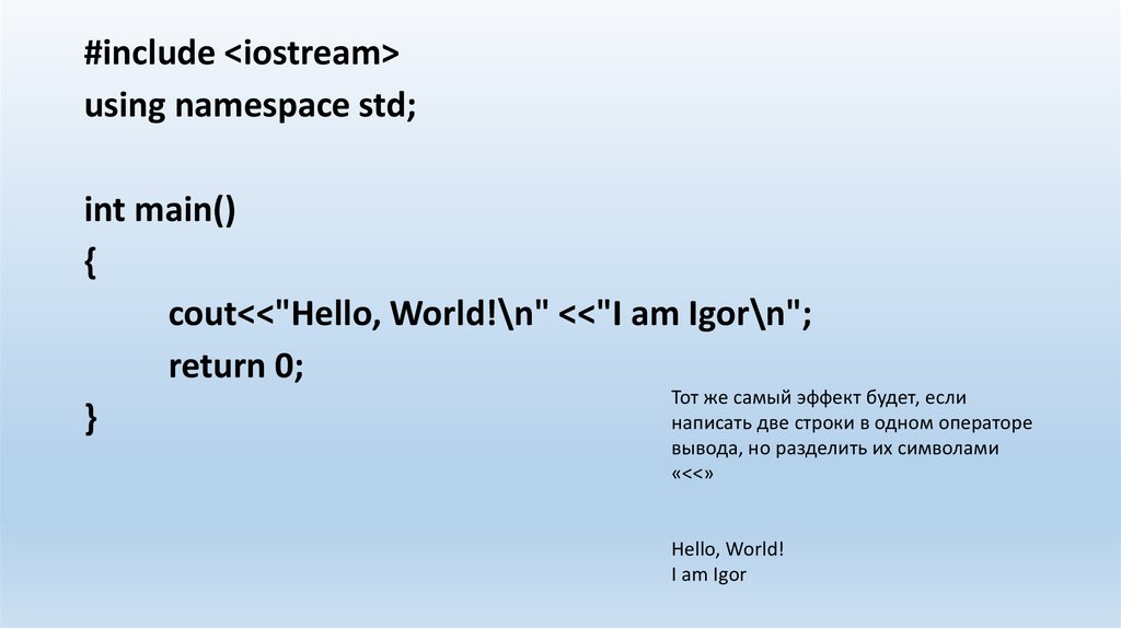 cout<<"Hello, World!\n" <<"I am Igor\n";