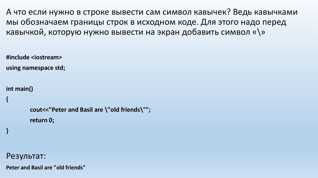 А что если нужно в строке вывести сам символ кавычек? Ведь кавычкамимы обозначаем границы строк в исходном коде. Для этого надо перед