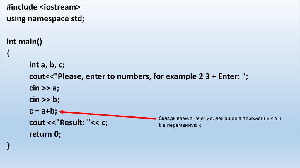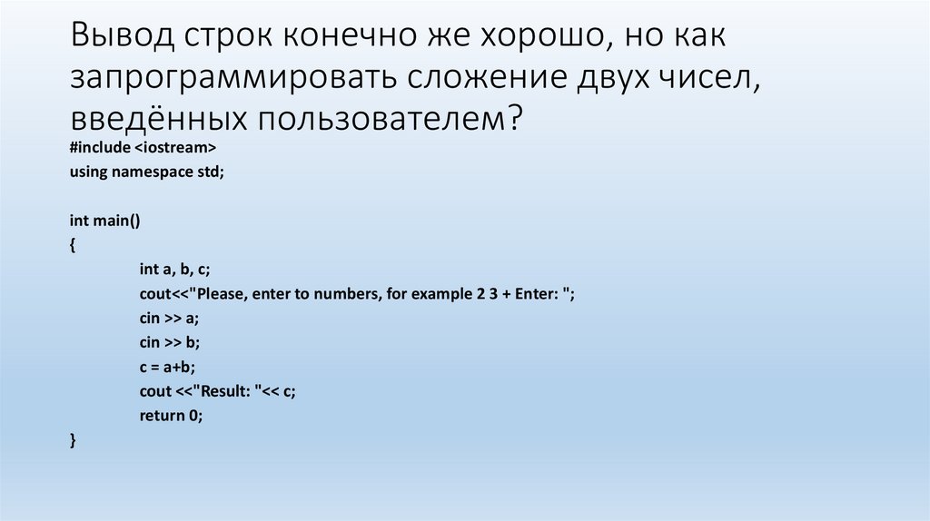 Вывод строк конечно же хорошо, но какзапрограммировать сложение двух чисел,