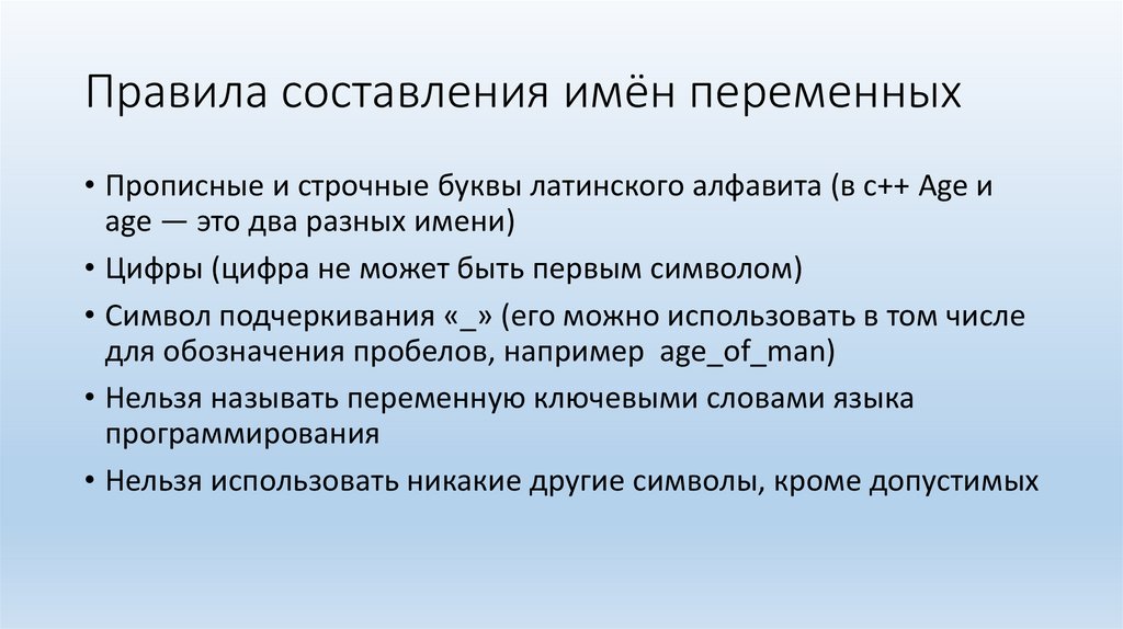 • Символ подчеркивания «_» (его можно использовать в том числе