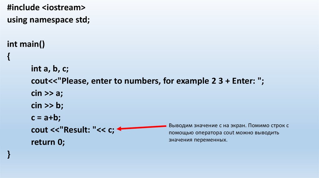 cout<<"Please, enter to numbers, for example 2 3 + Enter: ";
