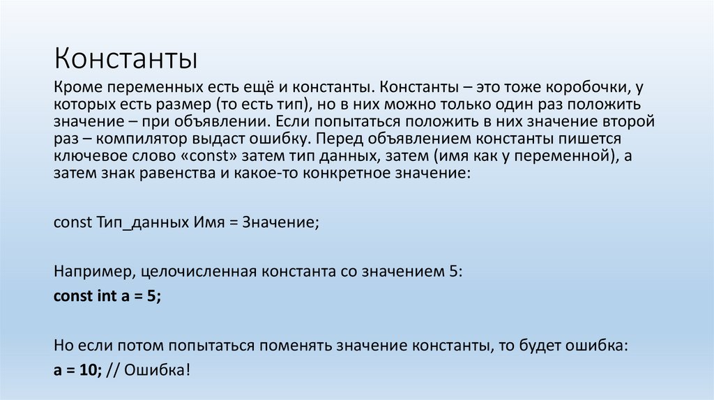 КонстантыКроме переменных есть ещё и константы. Константы – это тоже коробочки, у