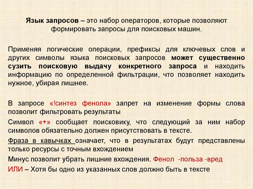 Язык запросов – это набор операторов, которые позволяютформировать запросы для поисковых машин.