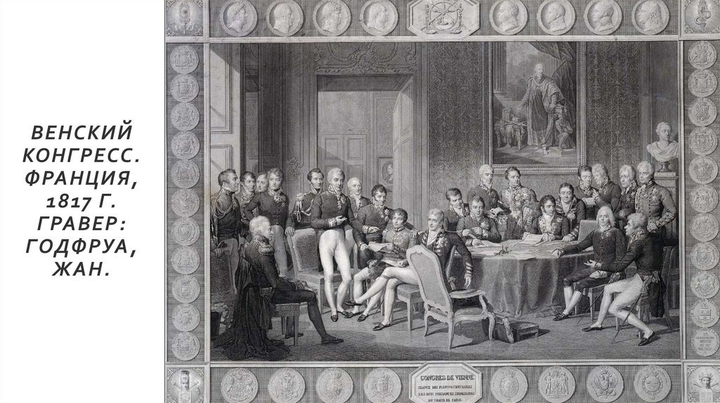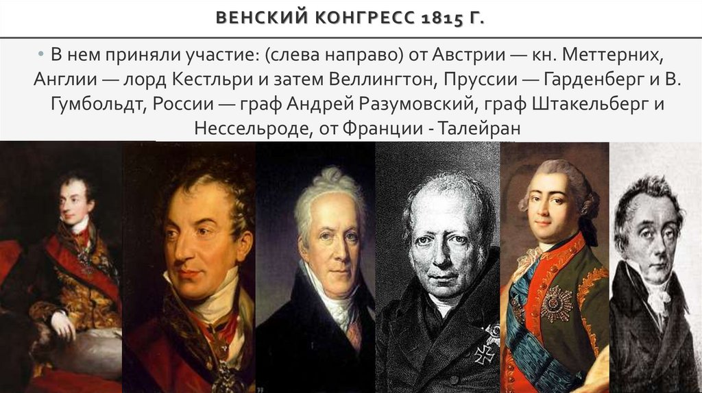 ВЕНСКИЙ КОНГРЕСС 1815 Г.• В нем приняли участие: (слева направо) от Австрии — кн. Меттерних,