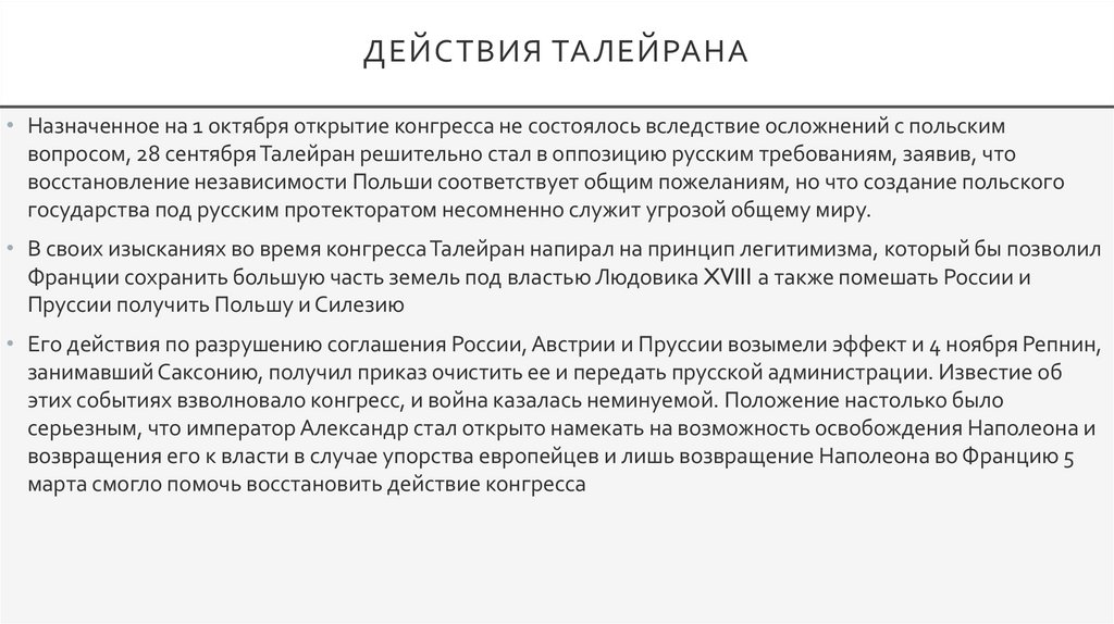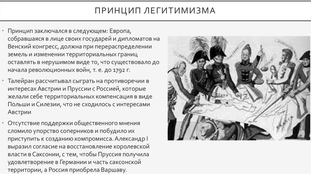 • В своих изысканиях во время конгресса Талейран напирал на принцип легитимизма, который бы позволил
