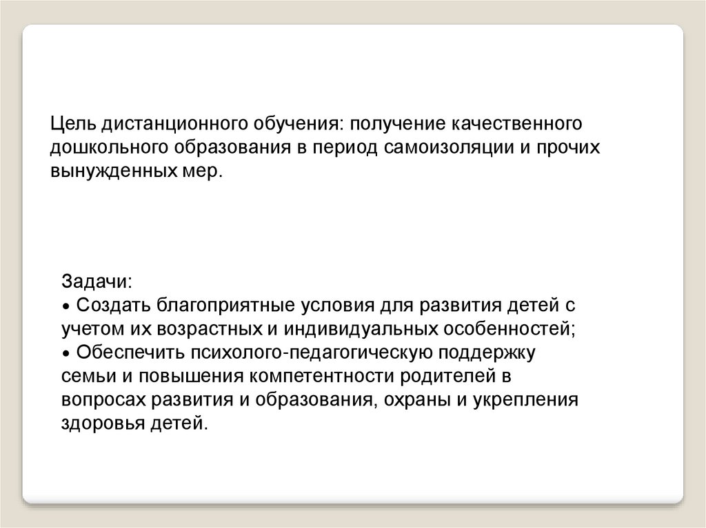 Цель дистанционного обучения: получение качественногодошкольного образования в период самоизоляции и прочих