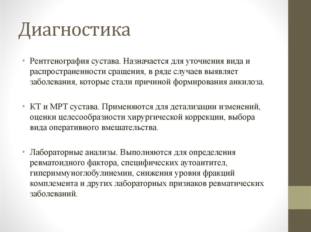 Диагностика• Рентгенография сустава. Назначается для уточнения вида и